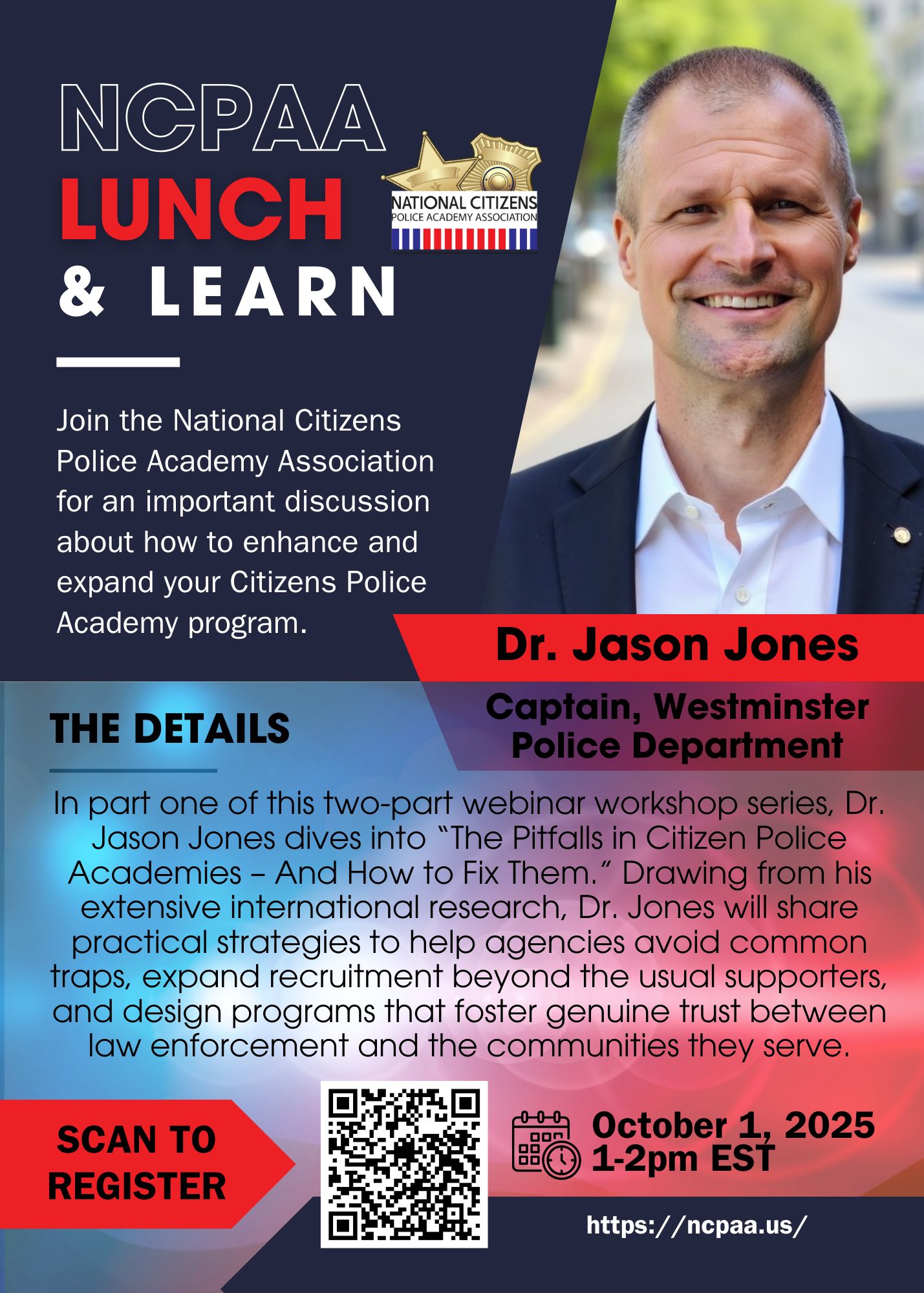 On October 1st, 2025 Jason Jones, current Captain at the Westminster Police Department and former Acting Commander of the Portland Police Bureau, will be providing a seminar based on his findings from his studies regarding Citizen Police Academies. The seminar will focus on the pitfalls of citizens academies and how to fix them. This seminar will be part one of a two part series that we are sure you will enjoy.